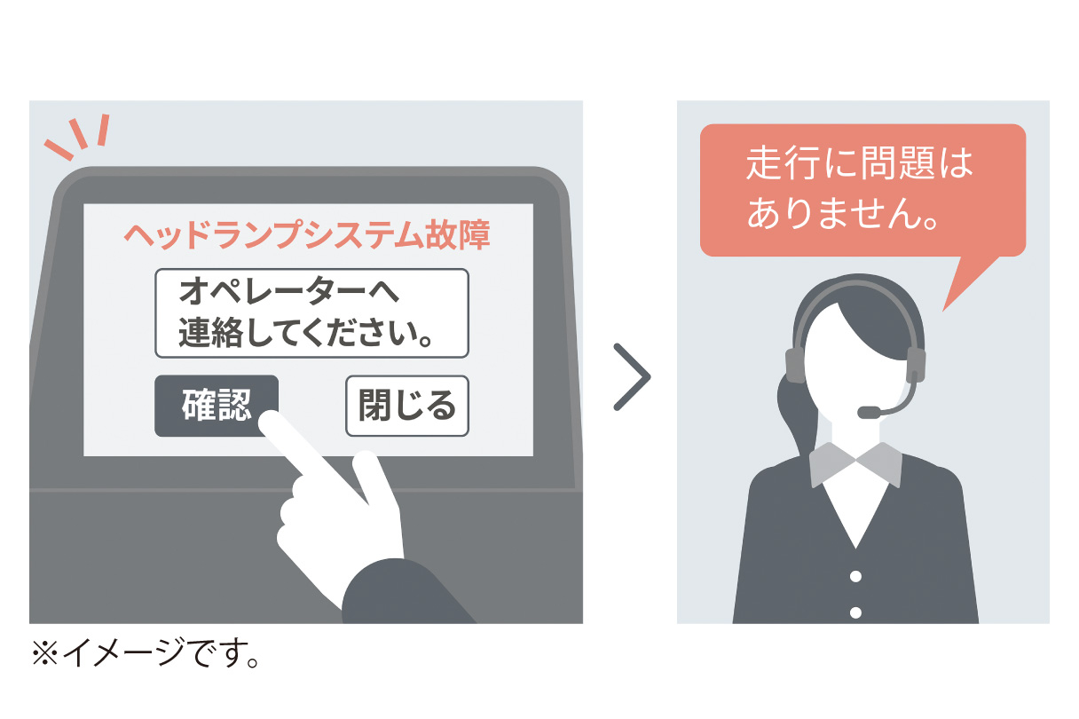 *1.サービスのご利用にはリモートメンテナンス店の登録が必要です。また、利用開始操作の翌日よりご利用いただけます。詳しくは、販売店におたずねください。 *2.販売店でのご対応は営業時間内に限ります。 *3.車両にOBD(On-Board Diagnostics)Ⅱ通信を行う機器を接続している場合、正しくサービスが行えない場合があります。 *4.すべての警告灯点灯時に実施するものではありません。走行に支障が出る可能性が高いものに限ります。