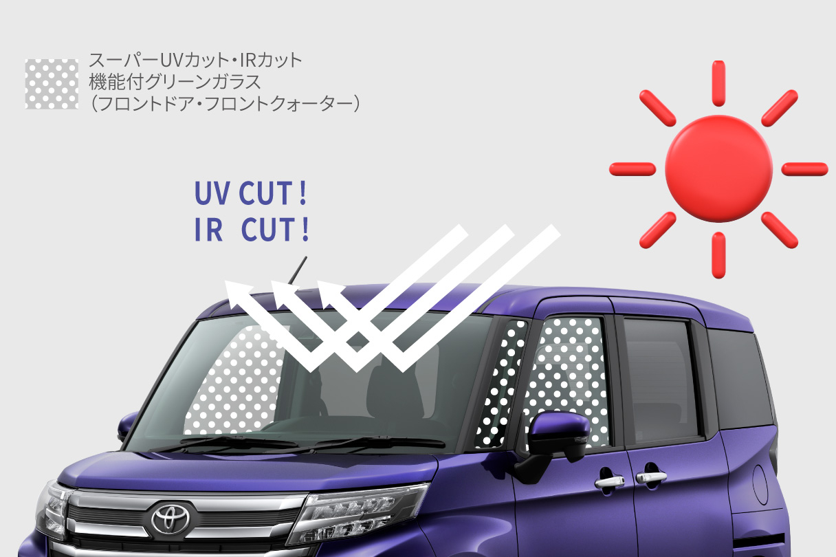 高いアイポイントと広いガラスエリア、水平基調のインパネによって、車両前方と周囲の状況をしっかり見渡すことができる見晴らしのよさを実現。さらに、フロントピラーに組み込んだガラスが死角を減らします。